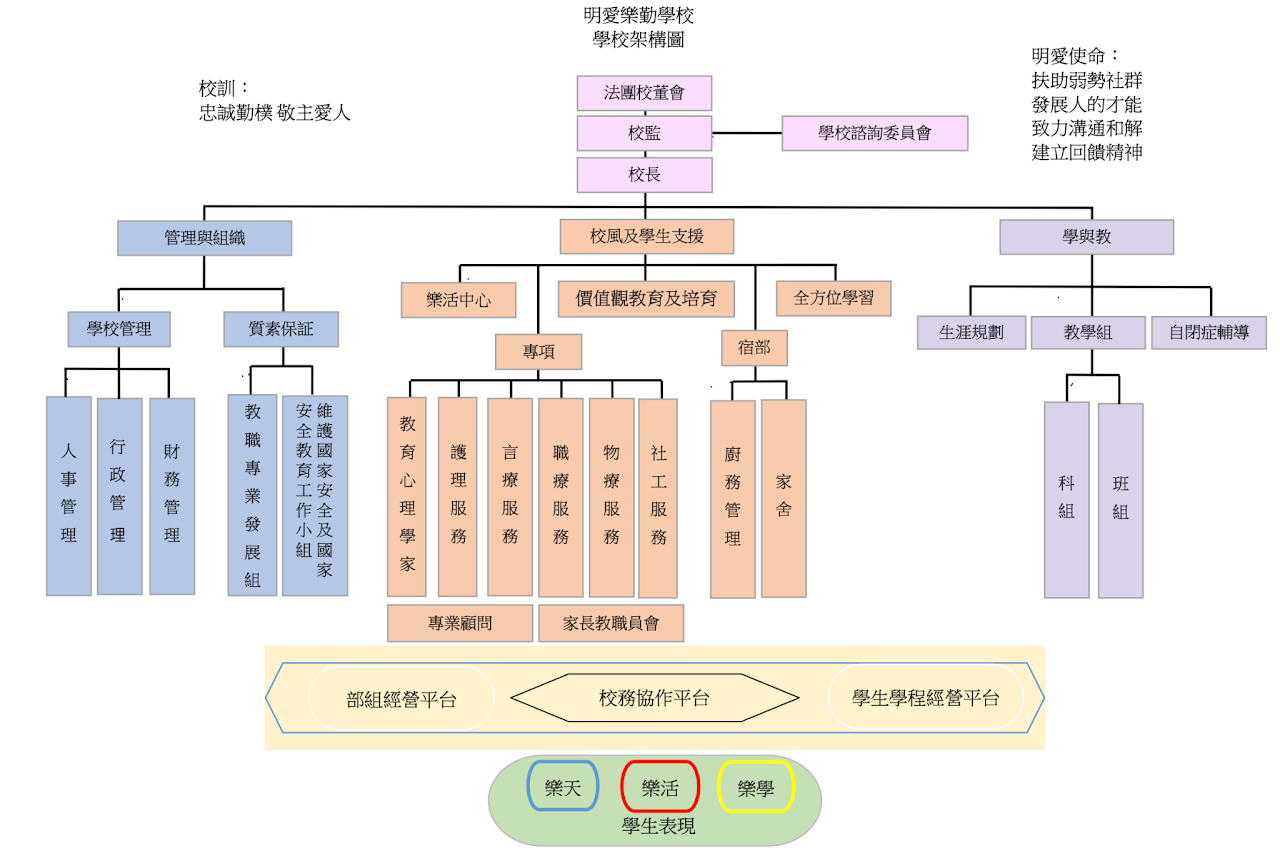 We adjust the school structure every year to respond to the changes of internal and external education environment. The executive units are mainly consist of academic department, student support (dormitory, Lohas Center and specialised service) and administrative support (care groups and school office) to assist the learning and development of our students. It is hoped to allow our students to master life skills and learn in a happy environment to prepare for the bright future.