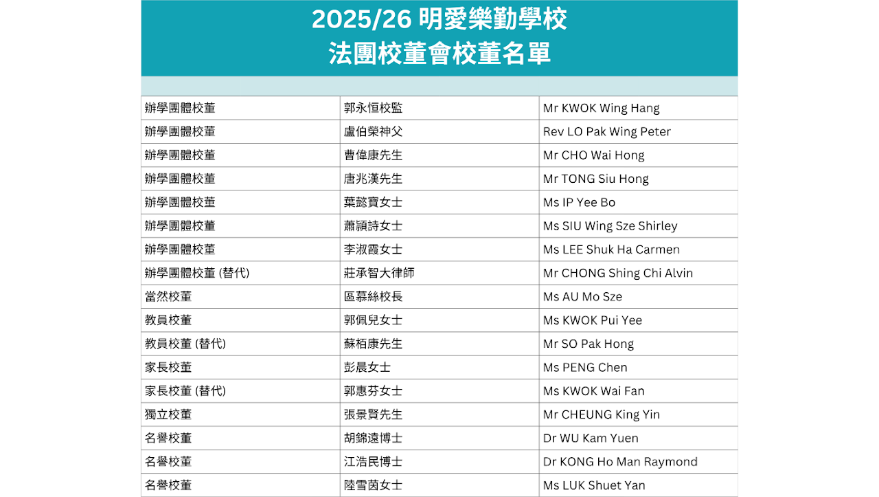 Caritas Lok Kan School adjusts its structure annually to respond to environmental changes. The core executive units consist of four main departments: Academic Affairs, Student Support, School Development, and Logistics (General Office), all working towards the goal of "Joyful Spirit, Joyful Life, Joyful Learning."